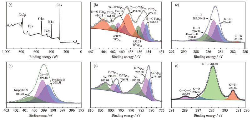图 2为MZ的XPS谱图。由图 2a可以观察到C、Ti、O、F、N和Co元素,其中N和Co元素可归因于ZIF-67的引入。图 2b为Ti2p高分辨XPS谱图,位于454.48 eV/459.38 eV、455.18 eV/460.78 eV、456.28 eV/461.98 eV、458.68 eV/464.18 eV的特征峰分别对应Ti—C、Ti2+、Ti3+和Ti—O,这可能是因为MZ在制备过程中发生了氧化;另外,Ti—C、Ti2+和Ti3+三个特征峰向低结合能方向移动,这可能是由于ZIF-67与MXene之间存在电荷转移[40]。MZ的C1s高分辨XPS谱图(图 2c)与MXene相比(图 2f),在285.08 eV处多了一个C—N峰[41-42]图 2d的N1s谱图中包含吡啶型N(398.58 eV)、Co—N(399.18 eV)和石墨型N(400.28 eV)[43],三者原子分数为40.88%、42.93%、16.19%。图 2e的Co2p谱图中出现Co3+(796.78 eV/781.08 eV)、Co2+(798.28 eV/782.58 eV)的特征峰及相应的卫星峰(803.08 eV/786.98 eV)[44-45]