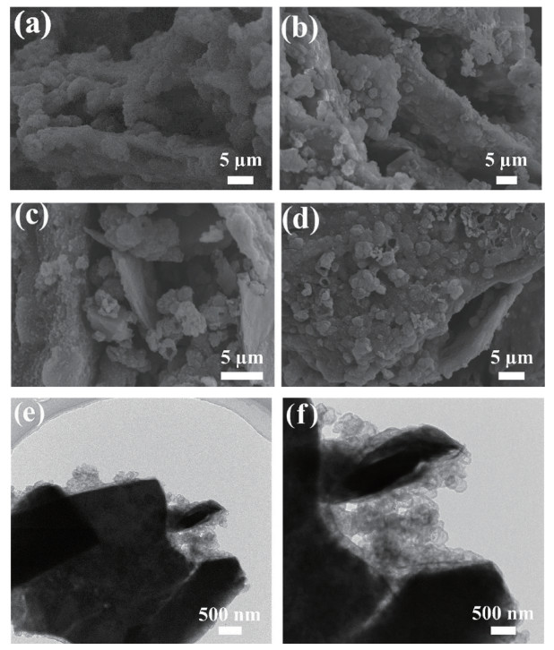 图 3.  (a、b) HMZ-5和(c、d) HMZ-10的SEM图; (e、f) HMZ-5的TEM图