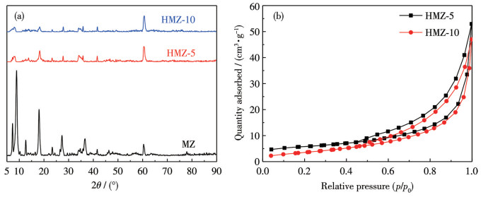 图 4  (a) MZ、HMZ-5和HMZ-10的XRD图; (b) HMZ-5和HMZ-10的氮气吸附-脱附等温线