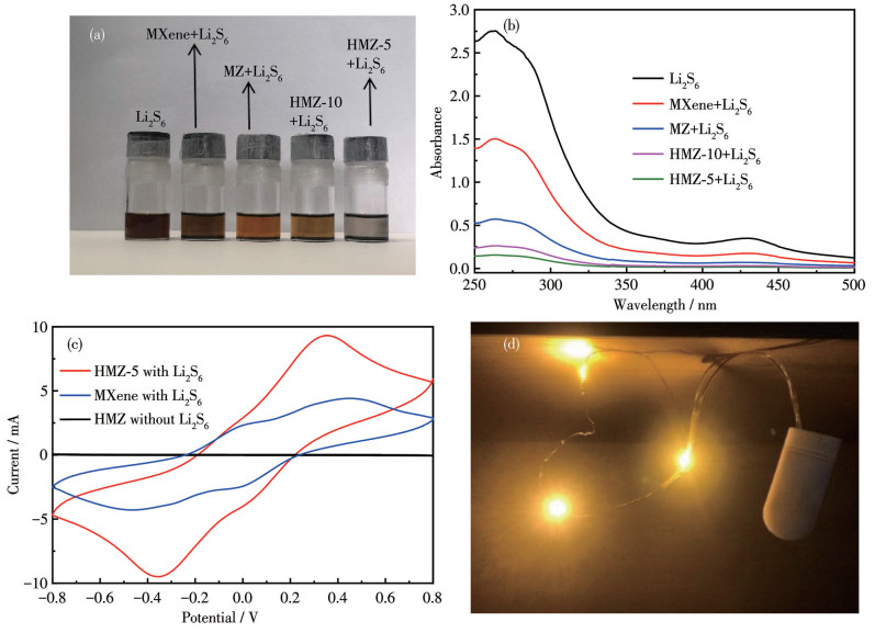 Figure 9  (a) Adsorption results of Li2S6 on sulfur host and (b) the ultraviolet-visible adsorption spectra of their supernatant; (c) CV curves of MXene and HMZ-5 symmetric cells at 10 mV·s-1 with or without Li2S6 electrolyte; (d) Digital photo of string lights after being powered by HMZ-5/S half cell