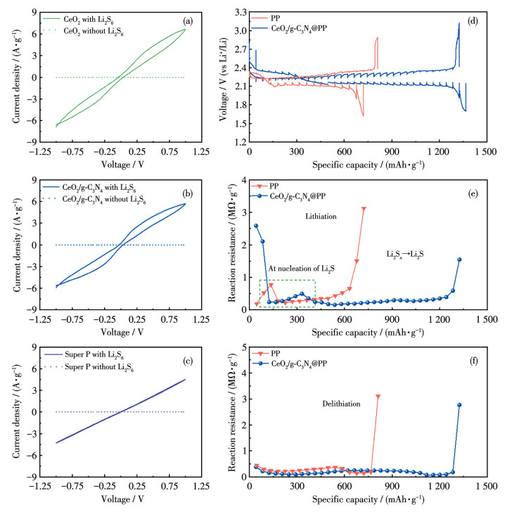 Figure 4  CV curves of (a) CeO2, (b) CeO2/g-C3N4, and (c) Super P symmetric batteries; (d) GITT curves and the corresponding (e) discharge and (f) charge process reaction resistance diagrams of Li-S batteries using PP and CeO2/g-C3N4@PP separators