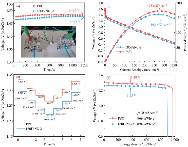 • Iron-nitrogen co-doped carbon-based catalyst (180FeNC-2) was prepared using sodium carboxymethyl cellulose (CMC) as a precursor. The results indicate that pre-deoxygenation treatment of CMC induces cleavage of glycosidic bonds, which facilitates a higher nitrogen doping level in the catalyst obtained from co-carbonization with a nitrogen precursor. This process also promotes the formation of well-defined thin carbon sheets, constructing a hierarchical mesoporous structure that enhances mass transport and exposure of active sites during the catalytic reaction. The resulting catalyst (180FeNC-2) exhibited an oxygen reduction reaction half-wave potential of 0.887 V (vs RHE), an electrochemical active surface area of 11.26 mF·cm-2, and a charge transfer resistance of 81 Ω in an alkaline electrolyte. Its catalytic performance surpasses that of the catalyst (0FeNC-2) derived from untreated CMC and was comparable to the standard Pt/C catalyst, while also demonstrating excellent stability and methanol tolerance. A zinc-air battery assembled based on 180FeNC-2 delivered an open-circuit voltage of 1.478 V, a maximum power density of 162 mW·cm-2, and could stable discharge at 1.25 V under a current density of 10 mA·cm-2.