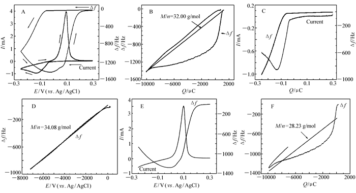I/Δf-E curves(A, C, E) and M/n values(B, D, F) for deposition-dissolution process(A, B), deposition process(C, D), dissolution process(E, F)