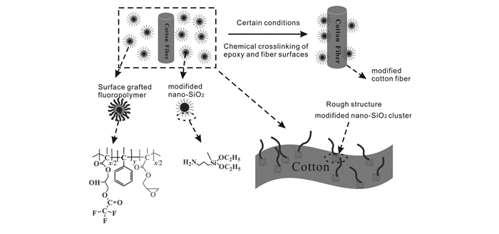 • At present, there are many preparation methods for superhydrophobic materials, but most of them have the disadvantages of complicated preparation processes. In this paper, the traditional free radical polymerization method was used to prepare super-hydrophobic materials with excellent performance by simple operation using organic and inorganic materials commonly used in the market as raw materials. The method for preparing superhydrophobic materials in this study can be widely applied to hydrophobic modification of various substrate materials. The crosslinkable precursor polymer P(GMA-r-St) was synthesized by conventional radical polymerization using glycidyl methacrylate(GMA) and styrene(St) as monomers. Further, it was graft-modified with trifluoroacetic acid(TFA) to prepare a fluorine-containing epoxy polymer P(GMA-r-St)-g-TFA. Nano-silica(SiO2) was modified by γ-aminopropyltriethoxysilane(KH-550) and characterized by Fourier transform infrared spectroscopy(FTIR) and thermogravimetry(TG). A superhydrophobic modified material prepared by mixing amino-modified nano-silica with a fluorine-containing epoxy polymer, and the surface of the cotton fabric is soaked to rapidly construct a super-hydrophobic structure. By changing the content of modified nanoparticles, the hydrophobic properties and solvent resistance of the constructed cotton fabrics were investigated. The results show that the cotton fabric with immersion modification has a water contact angle of 160° and a solvent resistance time of 130 min, which has good solvent resistance.