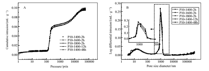 A.mercury pressure-cumulative intrusion(1 psia=6.890 kPa); B.pore volume-pore size