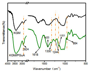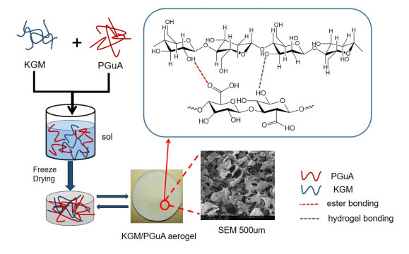 • A novel konjac glucomannan (KGM)/poly(galacturonic acid) (PGuA) mixed aerogel (KGM/PGuA) was prepared via a vacuum freeze-drying method, and its interaction mechanism was studied. The rheology results showed that KGM/PGuA mixed gels are typical non-Newtonian pseudoplastic fluids, and PGuA increased the viscosity of the composite aerogel and strengthened the molecular entanglement between KGM and PGuA molecules. The structures of KGM/PGuA aerogels were characterized by Fourier transform infrared spectroscopy (FT-IR), X-ray diffraction (XRD) and scanning electron microscopy (SEM). The results show that the intermolecular interactions were mainly hydrogen bonding. Dense and uniform porous structures were found in the aerogel microstructures. All these findings indicate that PGuA has the effect of enhancing the KGM gel structure, and KGM/PGuA gels with porous structures might be potential materials for use in food and biomedical areas for loading active materials.