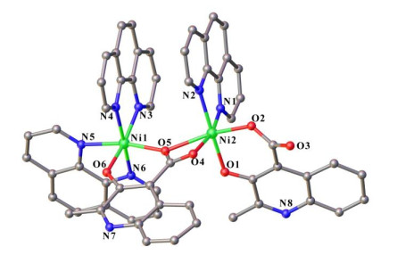 • A novel nickel complex [Ni2L2Phen3]·3H2O (HL = 3-hydroxy-2-methylquioline-4-carboxylic acid) has been synthesized by a hydrothermal approach and is structurally determined by single-crystal X-ray diffraction. The title complex crystallizes in triclinic space group P\begin{document}$ \overline 1 $\end{document}. Crystal data for the title complex: C58H44N8Ni2O9, Mr = 1108.35, a = 11.8648(4), b = 12.7369(4), c = 17.0728(5) Å, α = 97.694(3), β = 96.702(2), γ = 99.566(3)°, V = 2495.66(14) Å3, Z = 2, T = 293(2) K, Dc = 1.475 g/cm3, μ(Mo) = 0.824 mm–1, F(000) = 1140, R = 0.0757, wR = 0.2129 and GOF = 1.017. The nickel ions are surrounded by five oxygen and six nitrogen atoms to yield two slightly distorted octahedral geometries. Solid-state photoluminescence spectrum reveals that it shows blue purple emission. Solid-state UV/Vis diffuse reflectance spectroscopy exhibits that it has an optical band gap of 1.702 eV.