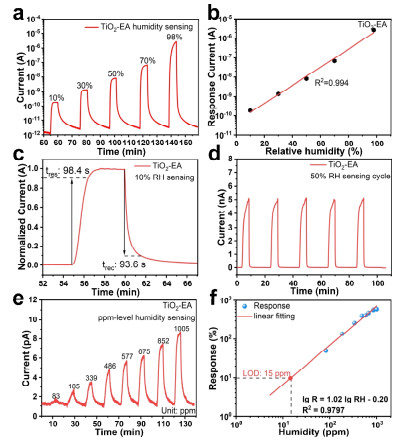 • As a kind of two-dimensional (2D) nanostructured materials, metal oxide nanosheets (MONS) are attractive and promising humidity sensing materials due to their considerable surface area, good charge carrier transportation, and designable surface functional groups properties. Nevertheless, the ultra-thin MONS modified with active functional groups for humidity sensing are still rare. As a proof of concept, the atomically thin TiO2 nanosheets with high surface area and electron-donating amino groups are prepared by a structure-maintained post-ligand modification strategy. The fabricated TiO2-based sensors demonstrate superior humidity sensing performance with high response, short response time, narrow hysteresis, and ultra-low theoretical limit of detection of about 15 ppm. Additionally, the possible mechanism is proposed from the AC complex impedance measurements and DC instantaneous reverse polarity experiments. This work provides a possible path for developing the high-performance 2D nanostructured metal oxides-based humidity materials through the surface chemical method.