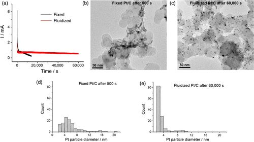 随后,该工作以析氧反应(OER)(图3)、甲醇氧化反应(MOR)及析氢反应(HER)(图4)三个经典电催化反应为模型,验证了流动电催化策略的确可极大缓解一系列不同催化剂疲劳机理,如高过电位下催化剂颗粒的团聚与溶解、反应中间体的毒化、催化剂粉化及脱落等。在OER与MOR模型中,通过考察单个催化剂颗粒所贡献的法拉第电量,发现即使在单个流动Pt/C颗粒的贡献远远大于固定颗粒的情况下,前者的烧结程度也不明显,但后者却已经彻底烧结了。这表明在流动电催化反应中,催化剂颗粒的抗疲劳性能的确得到了提升。