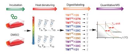 2013年, 来自瑞典科学家开发了一种名为细胞热稳定性迁移试验(Cellular Thermal Shift Assay, CETSA)的新工具, 用于直接检测各类药物与细胞中靶标蛋白的结合[92, 93].其核心概念是:当药物分子结合靶标蛋白时会表现出热稳定性的变化.早期, 该方法更多通过免疫印迹实验(Western blot)应用于靶标验证工作, 因此必须依赖于合适的抗体, 从而限制了该方法的无偏见性.随着平行多通道定量蛋白质组学技术(iTRAQ/TMT)的发展, 来自欧洲分子生物学实验室的Savitski研究组[94]开发出一种全新的基于蛋白质热稳定性的高通量靶标筛选方法——蛋白质组热稳定性分析技术(Thermal Proteome Profiling, TPP).其具体做法是, 在活细胞和细胞裂解液层面同时准备若干个等份(通常是10个)的对照样品(DMSO)和用天然产物小分子处理的样品.将各组中的每个等份样品进行不同温度的热处理, 并通过超高速离心(100000 g)除去变性/聚集的蛋白质.剩余的可溶蛋白通过SDS-PAGE分离后, 进行胶内酶解并对肽段进行稳定同位素标记.将不同温度处理的样品混合后进行离线肽段分级, 最后利用定量质谱分析肽段的相对含量并得到每个蛋白在小分子处理组和对照组的熔化曲线并计算熔点值Tm(即某蛋白绝对量减少一半时的温度), 根据小分子处理组和对照组的熔点变化值ΔTm来指示小分子和蛋白有无直接作用(图 7).一般认为, 只有在活细胞和细胞裂解液层面同时观察到Tm值在加入小分子后同向变化的蛋白才有可能是小分子的直接靶标.在用ATP分子进行概念验证后, 作者通过TPP方法鉴定了50多个星形孢菌素(Staurosporine)的靶标蛋白, 其中包括一个与亚铁血红素Heme生物合成相关的蛋白亚铁螯合酶(Ferrochelatase, FECH).进一步研究发现, 该酶是很多激酶抑制剂类药物引起光毒性副反应有关的脱靶蛋白(off target).早期的TPP方法仅适用于可溶性胞浆蛋白, 随后, 研究人员发现在裂解缓冲液中加入少量去垢剂(0.4% NP-40)并不会引起热变性/聚集蛋白的复溶, 从而将该策略的应用拓展到与小分子相互作用的膜蛋白上[95].同时, 来自奥地利等国的科研人员改进了TPP方法的实验细节, 使之更易于操作[96].比如, 在分离变性/聚集蛋白时使用普通的低速离心(17000 g); 采用超滤辅助样品制备(Filter Aided Sample Preparation, FASP)的方法进行溶液酶切; 以及数据处理过程的优化.