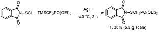 我们首先设想以现场生成的AgCF2PO(OEt)2与易得的邻苯二甲酰亚胺次磺酰氯反应合成N-硫二氟甲基膦酸二乙酯邻苯二甲酰亚胺PhthSCF2P(O)(OEt)2. 发现TMSCF2P(O)(OEt)2与氟化银在乙腈溶剂中反应, 不能够得到AgCF2P(O)(OEt)2. 相反, 观察到了银镜的生成. 我们推测AgCF2P(O)(OEt)2在室温下不稳定, 发生自身歧化反应而分解. 因此, 设想降低反应温度来稳定关键的中间体AgCF2P(O)(OEt)2. 发现在-40 ℃条件下, 由TMSCF2P(O)(OEt)2与氟化银在乙腈溶剂中反应得到的AgCF2P(O)(OEt)2是稳定的, 氟谱跟踪显示反应收率定量. 随后在反应液中直接加入1.5 equiv. 邻苯二甲酰亚胺次磺酰氯, 在-40 ℃下反应2 h, 即能以5.5 g规模30%的分离收率, 制备该亲电氟烷硫基试剂N-硫二氟甲基膦酸二乙酯邻苯二甲酰亚胺PhthSCF2P(O)(OEt)21. 该化合物结构由1H, 13C和19F核磁共振谱确定, 并通过其单晶的X-射线衍射确证.