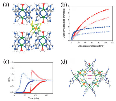 2016年, Vaidhyanathan等合成了一例具有选择性吸附CO2的HOF料(IISERP-HOF1[43]或HOF-11[44]). IISERP-HOF1在晶体学a方向具有一维的孔道(0.94 nm×0.91 nm) (图 9a), 比表面积高达1025 m2•g-1. IISERP-HOF1可以吸附4.8 mmol•g-1 (1.01×105 Pa, 273 K)或2.9 mmol•g-1 (1.01×105 Pa, 303 K)的CO2, 但却基本不吸附N2(图 9b).在0~1.01×105 Pa之间, IISERP-HOF1的CO2/N2 (15:85) IAST分离系数高达240~350 (图 9c).此外, 其它微孔的HOFs材料如HOF-5[87]、HOF-7[89]、HOF-8[98]和HOF-9[90]等也具有十分优异的CO2捕集与存储性能.
