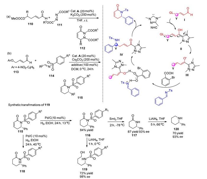在此基础上, 我们课题组[63]在α, β-不饱和醛γ位碳原子引入新型的离去基团(4-NO2-C6H4) 113, 高效率、高选择性地实现了γ位碳原子的活化.与以前工作不同, 我们采用了离去能力较强的4-硝基苯酚作为离去基团; 另外, 在Ye等报道的反应中, γ位需要其他基团来稳定卡宾催化的活性中间体, 而我们实现了γ位无额外取代的不饱和醛的活化, 成功构建了一类内酰胺分子骨架115 [Scheme 11, (b)], 并可以通过一系列反应转化为多样化的药物合成中间体, 如吡啶120、氨基醇119等.该反应可能的机理如Scheme 11所示:首先, 一分子不饱和醛与一分子卡宾催化剂反应生成中间体Ⅱ, 该中间体通过离去基团的离去发生分子内消除反应生成中间体Ⅲ, 中间体Ⅲ在4-溴苯甲酸的作用下与另一底物亚胺作用生成中间体Ⅳ, 中间体Ⅳ发生分子内亲核取代反应, 释放产物分子以及卡宾催化剂参与下一个循环反应.