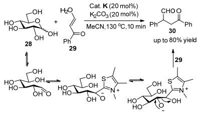 分子间Stetter反应可用于合成多种分子的前体结构.从20世纪70年代起, Stetter着手研究手性催化剂对该反应的影响开始, 一系列新的偶联配体陆续被报道. 2009年, You课题组[23]发现醛类结构在卡宾催化剂作用下可以与芳基磺酰吲哚发生偶联.该反应的关键在于对甲苯磺酰基在碱的作用下容易离去, 产生相应的α, β-不饱和亚胺离子作为迈克尔受体参与Stetter反应, 这类型反应适用于大多数芳香醛, 而脂肪醛类的产率较低(Eq. 12).然而他们发现这些产率较低的脂肪醛的产物24, 都具有较好的立体选择性(90%~97% ee). Liu课题组[24]在2012年首次将Stetter反应运用在糖基化过程中(Eq. 13), 当卡宾与醛结合后可增强反应中心电性, 容易与硝基取代的糖结构发生迈克尔加成, 这为糖基化的发展提供了新思路.在不断探索中, 新的羰基供体也不断被发现. Massi等[25]发现二酮类结构可作为羰基供体与查尔酮发生Stetter反应. Chi等[26]发现碳水化合物28通过糖结构的羟醛缩合互变特点, 在三氮唑卡宾催化下可以与查尔酮29发生Stetter反应(Scheme 3), 他将传统意义上的羰基扩展到碳水化合物中的羟醛缩合, 丰富了卡宾的催化范围.
