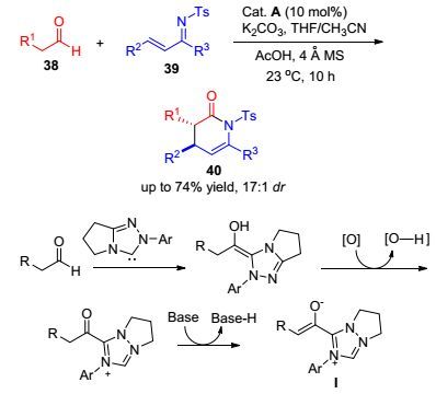 2011年, Chi课题组[27]报道了一种由α, β-不饱和醛18与α位具有吸电子基团取代的α, β不饱和酮32生成δ内酯33的方法.该方法不仅以较好的收率和对映选择性得到相应的内酯衍生物, 其最大的特点在于通过在α, β-不饱和酮的α引入合适的吸电子基团高效地避免了不饱和醛发生传统的高烯醇反应(β活化) (Eq. 14).取代咪唑类作为一种优势骨架经常出现于具有抗人类免疫缺陷病毒(HIV)、抗抑郁和抗病毒的生物活性分子结构中. 2013年, Scheidt课题组[28]通过在咪唑骨架34上引入适当的基团, 实现了与α, β-不饱和醛18中α-碳原子的偶联, 形成多元杂环产物35.该反应不仅产率高、对映选择性好, 且生成的目标产物可以通过开环反应得到具有生物活性的化合物结构(Eq. 15). 2015年, Chi课题组[29]首次报道了一例在氮杂环卡宾与布朗斯特酸共催化下, α, β-不饱和醛18的α-胺烷基化反应.该反应不仅具有较好的收率和对映选择性, 且反应生成的β-氨基酯37通过简单的转化可进一步生成具有重要功能的β-氨基酸(Eq. 16).