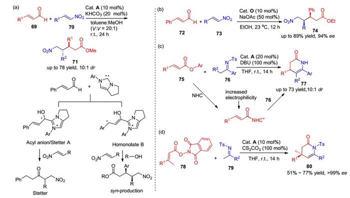2009年, Nair等[45]首次报道了二烯醛与硝基烯在非手性咪唑鎓盐催化下通过高烯醇中间体生成目标产物, 并取得较好的产率.在此基础上, Liu等[46]首次提出利用手性三唑鎓盐催化二烯醛与硝基烯的不对称合成, 实现了芳香二烯醛及脂肪二烯醇69与芳香硝基烯70合成产物71 [Scheme 8(b)], 很好地解决了分子手性选择问题. 2013年Rovis课题组[47]报道了氮杂环卡宾催化α, β-不饱和醛72与硝基烯73的分子间加成反应, 得到高收率、高选择性的顺式产物.该方法的重要意义在于通过使用适当的催化剂, 可以选择性地使反应只沿着高烯醇途径发生, 避开了反应过程中更容易进行的Stetter反应途径[Scheme 8(a)].