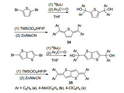 然而, 上述合成路线中的正离子中间体的稳定性较差, 以致不易分离.为克服该缺点, Takeda等[51]在2015年对该合成路线进行了改进(Scheme 6).在新路线中, 作者改用路易斯酸TMSClO4来代替高氯酸进行脱羟基反应, 原位获得正离子中间体后再将TMSClO4蒸除, 加入还原剂Zn得到产物.采用该路线可将制备化合物34和35的最后一步反应收率从6%大幅提升至99%.由于给电子效应显著, 二苯基亚甲基难以维持具有较大体系的醌式噻吩结构, 该类醌式化合物的母体仅限于噻吩、噻吩并噻吩和联噻吩[52, 53].