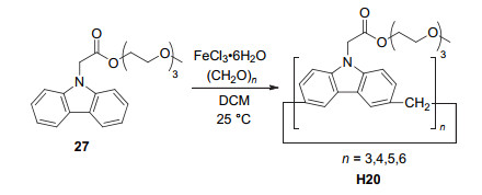 杨鹏等[59]由咔唑衍生物27出发, 在二氯甲烷为溶剂、六水合三氯化铁为催化剂条件下与多聚甲醛缩合反应, 以20%的产率得到杯[3]咔唑(Calix[3]carbazole) (Scheme 27).更大的环聚体如杯[4]~杯[6]咔唑亦能够生成, 但由于纯化困难, 因而未做进一步研究.杯[3]咔唑可形成一端封闭的锥形结构, 与钾离子通道大小相当, 此外该大环具有较深的富电子空腔, 对体积较大的四乙基氯化铵客体具有较好的络合性质, 在有机体系中络合常数可达102 L/mol.