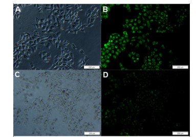 Additionally, to testify the capability of being taken up by live cells of the Ac-Phe-BODIPY, HeLa cells were chosen as a biological medium for these chemosensing experiments and the first point of study involved cell viability testing. Results revealed that when the concentration of Ac-Phe- BODIPY at concentrations reached 100 μmol/L, the cell viability reached the lowest value of 75%, and high concentration of Ac-Phe-BODIPY (1000 μmol/L) was helpful for cell proliferation. Ultimately, fluorescence imaging towards ONOO- operated in HeLa cells was employed for the staining study to prove the biologically discernable ability of Ac-Phe-BODIPY. As shown in Figure 4 (A, B), incubated with 1 μmol/L Ac-Phe-BODIPY within 15 min, the imaged HeLa cells displayed bright green fluorescence. Next the cells were incubated with 100 μL (10 μmol/L) ONOO- for 5 min, control cells (cells treated with Ac-Phe-BODIPY) were almost non-fluorescent (Figures 4C, 4D).