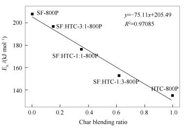 • The influences of gasification temperature (800-950℃) and blending ratio (3:1, 1:1, 1:3) on the isothermal CO2 co-gasification reactivities of Shenfu bituminous coal char (SF char) and HTC char were investigated using an atmospheric thermogravimetric analyzer (TGA). Moreover, the activation energy of char gasification and its influence factors were explored. The results show that the greater surface area and the higher ash content are the main reasons for the high gasification reactivity of HTC char. The reactivities of mixtures with low HTC char proportion are more sensitive to temperature at low temperature range. The activation energy increases with the increase of carbon conversion, and the activation energy correlates well with the blending ratio and the molar ratio of active (K+Na)/Ca in the char.