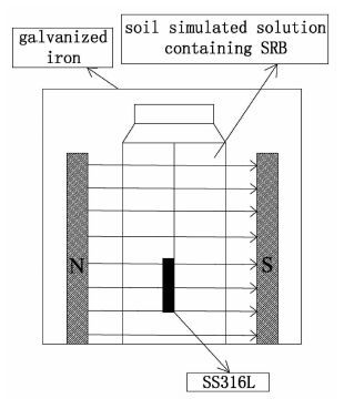 常规防治微生物的手段是加入杀菌剂,但加入大量的杀菌剂会对环境产生二次污染,因此寻找更好的抑制细菌生长的方法成为目前研究重点[9, 10]。Masahiro 等[11]研究发现,厌氧条件下的变形链球菌和葡萄球菌在强度为30~100 mT的恒定磁场下生长和代谢受到明显的抑制。现代生物磁学研究发现,磁场对细胞形态、排列、代谢、膜结构等多方面都有影响,磁场通过使影响负责细胞间转运物质传递信息的生物小分子、电子及原子受到洛伦兹力而导致细胞正常功能发生变化,导致机体内环境失衡[12]。另外,大量研究证实,一定强度范围内磁场可以减缓金属的腐蚀[13~15],而磁场对金属的微生物腐蚀是否有影响却鲜有报道。