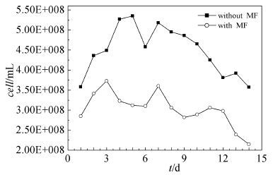 图 2为外加或未加磁场时SRB在土壤模拟溶液中的生长曲线。未加磁场时,SRB在1~4 d处于对数生长期,数量迅速增加,形成大量固着态菌落体;4~10 d,SRB处于稳定生长期,增长速率降低,细菌量基本维持稳定;10~14d,SRB进入衰亡期,由于菌量较多,细菌代谢所需营养物质不断减少,使得SRB繁殖量少于死亡量,细菌数量开始减小,活性减小。外加有磁场时,1~3 d,SRB处于对数生长期,细菌大量繁殖;3~10 d为SRB的稳定生长期,细菌数量几乎不变,达到稳定值;10~14 d,SRB快速死亡,进入衰亡期。未加磁场时土壤模拟溶液中SRB的数量明显多于加有磁场条件时,说明磁场对SRB在土壤模拟溶液中的生长有一定的抑制作用。