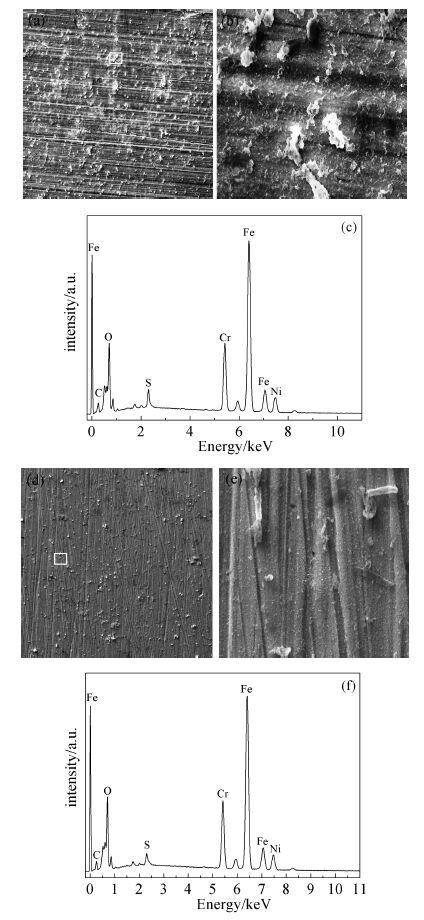 316L不锈钢表面膜层形貌及能谱分析如图 3所示,其中,图 3(a)为未加磁场时316L不锈钢表面膜层的形貌,图 3(b)为图 3(a)中方框内的局部放大图,图 3(c)为图 3(a)中方框处的EDS图;图 3(d)为加有磁场时表面膜层的形貌图,图 3(e)为图 3(d)中方框所标注位置的放大图,图 3(f)为图 3(d)中方框处的EDS图。从图 3(a)可知,未加磁场时,基体表面膜层不均匀,以局部堆积为主;而在加有磁场时,图 3(d)的表面膜层均匀整齐地附着于基体表面,局部堆积处明显减小。