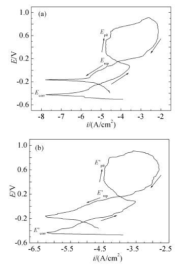 根据加或未加磁场时316L不锈钢在含SRB的土壤模拟溶液中浸泡不同天数所测得循环极化曲线特征可知,316L不锈钢在此体系中的腐蚀行为均属钝化膜破裂型点蚀。