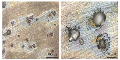 无论加或未加磁场,在回扫结束后,工作电极表面都有絮状腐蚀产物生成,去除产物后表面均有点蚀孔,点蚀孔表面形貌如图 5所示。由图 5可知,工作电极表面呈现较多斑点状蚀孔,每个蚀孔周围出现腐蚀程度不同的花边盖。由于蚀孔形成后,蚀孔的边缘处于钝化状态,而金属的进一步溶解发生在蚀孔更低的部位,形成根切,从而使孔表面形成花边状结构,花边盖表面会重复产生次生亚稳态点蚀[22]。