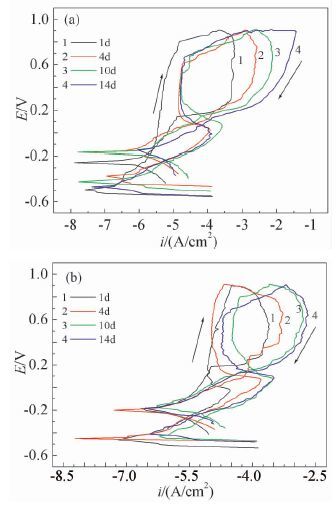 图 6为加或未加磁场时316L不锈钢在含有SRB的土壤模拟溶液中浸泡不同天数的循环极化曲线。未加磁场时,在浸泡的1~4 d,Ecorr逐渐升高,之后浸泡4~14 d,Ecorr又逐渐降低,如图 6(a)所示。这可能是由于1~4 d,细菌及其代谢产物吸附到工作电极表面形成表面膜层,表面膜层对工作电极有一定的机械保护作用,使得Ecorr正移;4~14 d,表面膜局部破裂并脱落,裸露的工作电极表面与土壤溶液中的侵蚀性离子接触,产生局部堆积的腐蚀产物,局部堆积处容易产生浓差电池,加速基体腐蚀,从而导致Ecorr负移。在加有磁场时,316L不锈钢的Ecorr随浸泡时间的增加不断正移,如图 6(b)所示。这可能是由于工作电极表面均匀致密的表面膜层起物理阻隔作用,抑制基体的腐蚀;另外由于磁场抑制SRB的生长及代谢过程,使得溶液的菌量及菌产生的腐蚀性代谢产物减少,溶液的腐蚀性降低,从而导致Ecorr正移。