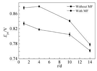 加或未加磁场时,316L不锈钢的Epit随浸泡时间的变化如图 7所示。Epit越高抗点蚀能力越强。未加磁场时在浸泡的1、4、10和14 d的Epit分别为834、778、755和761 mV。此时Epit的变化与SRB的生长代谢有关,SRB在接种后的1~4 d进入对数增长期,第4天时细菌量达到最大值,活性高,腐蚀性最强,使得溶液对基体的腐蚀性大于工作电极表面膜层的机械保护作用,致使第4天时的点蚀电位降低;稳定期内细菌数量基本维持不变,但代谢过程旺盛,使得溶液腐蚀性不断增大,导致浸泡4~10 d的Epit继续负移;之后,细菌进入衰亡期,活性降低,对点蚀电位影响不大,故Epit在较小范围内波动。当加有磁场时,浸泡1、4、10和14 d的Epit分别为876、879、831和778 mV。由于磁场抑制SRB的生长代谢,在浸泡的1~4 d溶液腐蚀性变化并不大,工作电极表面吸附膜层的机械保护占主导作用,使得Epit正移;稳定期细菌代谢旺盛,溶液中胞外聚合物逐渐积累增多,呈酸性且含有许多官能团[25],与溶液中的金属离子络合,加速金属腐蚀,使得Epit逐渐负移。相同的浸泡时间,加有磁场时的Epit大于未加磁场时的,说明磁场的加入可以增强316L不锈钢的抗点蚀性能。
