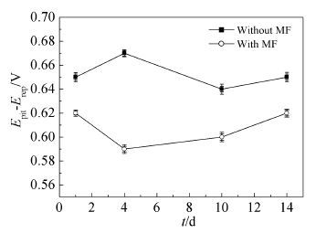 在循环极化曲线中滞后环的存在表明电极表面出现点蚀,通常滞后环面积越大表面钝性破坏越大,其恢复钝性的难度就越大[26]。衡量滞后环的指标是Epit-Erep,Epit-Erep越大,点蚀的发展趋势越大,钝化膜破坏后修复能力越弱。在加或未加磁场时,316L不锈钢的Epit-Erep随浸泡时间的变化如图 8所示。从图可知,未加磁场时,浸泡1、4、10和14d的Epit-Erep分别为650、670、640和650 mV,而加有磁场时,对应的值为620、590、600和620 mV,表明相同的浸泡时间下,未加磁场时的Epit-Erep值大于加有磁场时的,说明磁场加入后,不锈钢表面钝性被破坏程度减小,点蚀的发展得到有效抑制。