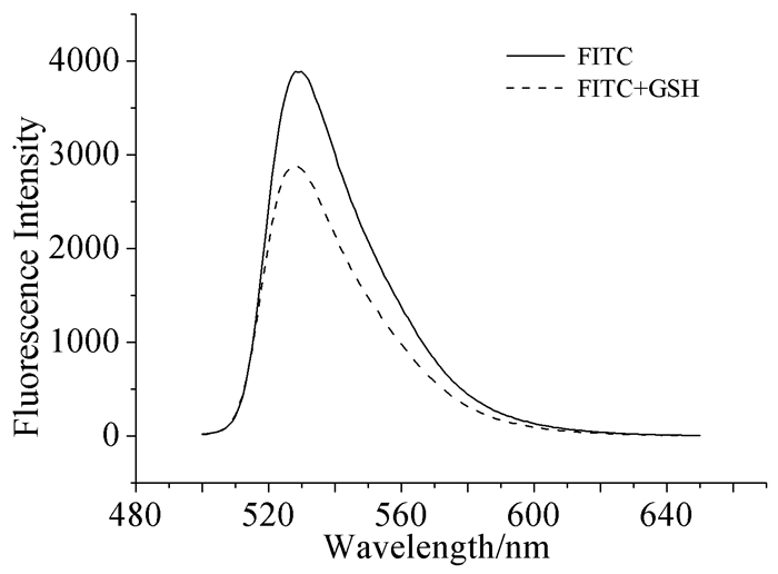 在FITC溶液中加入巯基化合物,分别扫描加入巯基化合物前后FITC溶液的荧光光谱,以加入GSH后的结果为例作图,如图 1所示,在加入GSH之后,FITC溶液的荧光强度出现了明显的下降。其机理是FITC的异硫氰基和GSH的巯基发生反应,生成新的不发荧光的物质[20],使荧光强度下降。