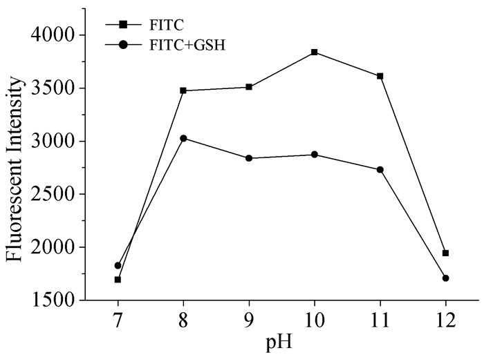 为了选取合适的pH条件,用不同pH的缓冲溶液配制FITC溶液,分别记录加入巯基化合物前后FITC溶液的荧光强度,以加入GSH后的结果为例作图,如图 2所示。从图中可以看到FITC在酸性时荧光强度很弱,随着pH的增大,荧光强度逐渐增强,在pH超过11之后荧光强度又迅速降低。加入GSH之后的FITC的荧光强度变化趋势也有类似的特点。考虑到在pH为10时FITC的荧光强度最高,且加入GSH之后荧光强度下降最明显,故选取pH10为最佳pH条件。