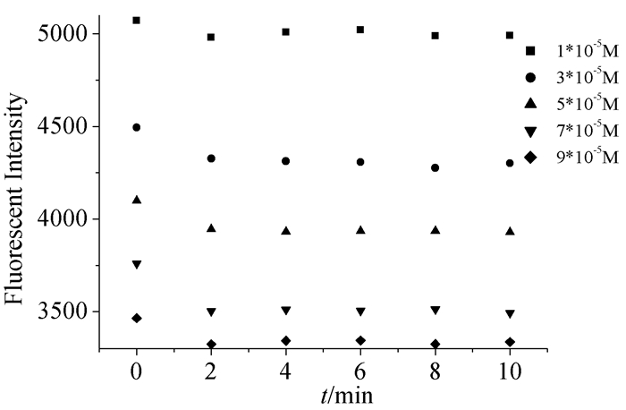 为了考察反应所需的时间,在FITC溶液中加入不同浓度的巯基化合物,从0min开始在不同的时间点记录荧光发射强度,以加入GSH后的结果为例作图,如图 3所示。从图中可以看到,在加入不同浓度GSH后,FITC溶液的荧光强度在0到2min内明显下降,在2min之后荧光强度变化趋于平缓。由此可以推断, GSH加入FITC溶液之后反应立即开始,并且在大约2min之内完成反应。为了保证足够的反应时间,且考虑到实际操作的可行性,选择在加入巯基化合物之后5min来测量荧光强度。