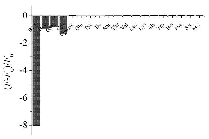 为了验证该方法的选择性,在FITC溶液中分别加入一系列巯基化合物和其他氨基酸,测定荧光强度,结果如图 4所示。从图中可以看到只有与含有巯基的GSH、Cys、GSH、DTT反应之后FITC的荧光强度出现了明显的降低,其他氨基酸的存在均不会使FITC的荧光产生明显变化。可见该方法具有良好的选择性。