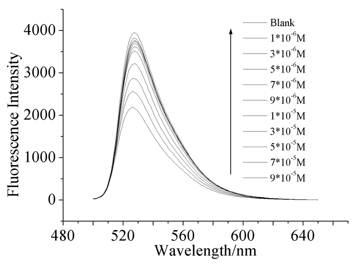 在2mL离心管中加入100μL 10-3mol/L的FITC和不同浓度的巯基化合物,然后用缓冲溶液调节体积至1mL,静置一段时间,以494nm为激发波长,在500~650 nm间扫描荧光光谱,记录528nm处的荧光强度。