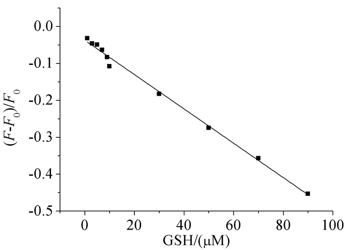 在上述优化条件下,在FITC溶液中加入不同浓度的巯基化合物,扫描荧光光谱,以加入GSH后的结果为例作图,如图 5a所示,随着GSH浓度的增加,荧光强度出现了有梯度的降低。以(F-F0)/F0随GSH浓度作线性关系图,结果如图 5b,在1~90 μmol/L得到了良好的线性关系,线性方程是Y=-0.00465C-0.03735,R2=0.994,其中Y是(F-F0)/F0,C是GSH浓度(μmol/L)。