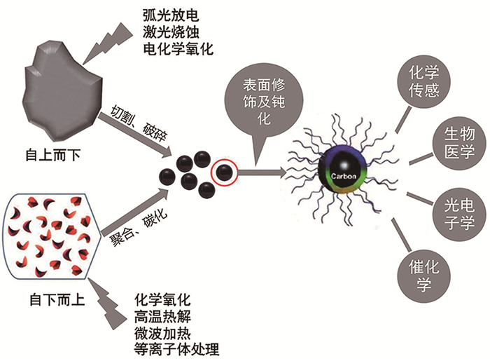 目前CQDs的合成方法已趋于成熟,宏观体系下的合成方法主要可以归纳为自上而下(top-down)与自下而上(bottom-up)两大类(如图 1)。