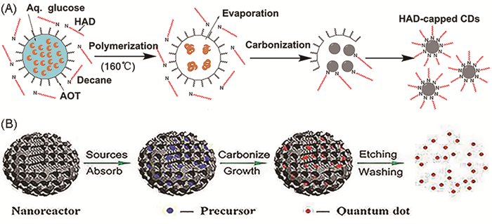 反胶束法亦称微乳液法。微乳液通常是指由有机溶剂、表面活性剂、助表面活性剂和水所组成的透明的、各相同性的热力学稳定体系。体系中由于表面活性剂的作用,形成互相隔离的油包水液滴,每一个液滴中单独地发生化学反应而很少有相互间的干扰,从而可以有效地减弱产物的过度生长及相互间的团聚现象。反胶束中纳米微粒的形成过程一般包括化学反应阶段、成核阶段和晶核生长阶段三部分,在反应结束后通过一定手段打破微乳液的平衡,达到水油分离,从而可以分离出反应产物。Kwon等[53]利用反胶束法可控地合成了荧光量子产率最高可达35%的CQDs。合成过程(图 2A)中以葡萄糖作为碳源,磺基琥珀酸二乙基己酯钠(AOT)为表面活性剂,在癸烷中形成油包水的反胶束,加入十六烷基胺(HAD)作为表面钝化剂用于CQDs的表面改性,在160℃氩气氛围中回流制得尺寸分布均匀的荧光CQDs。制备过程中葡萄糖溶液在油包水液滴中发生聚合反应,随着反应进行,液滴内水被蒸发,聚合产物进一步发生碳化反应,同时破坏微乳液体系,使初步合成的CQDs与液滴外的钝化剂AOT反应,最终可以得到表面包覆AOT的CQDs。通过调节水与表面活性剂的加入比例,可以可控地制备出4种不同尺寸(1.87、2.54、3.24、4.15 nm)的产物,相应的荧光量子产率分别为35%、31%、24%、19%。利用此方法实现了CQDs尺寸及性质的可控合成,体现出了微反应器在CQDs合成领域的应用前景。