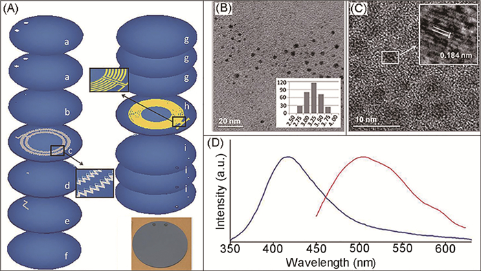 Gomez等[73]利用抗坏血酸作为碳源、二甲基亚砜为溶剂,通过高温热分解法在微流控芯片体系中进行了CQDs的合成实验。他们利用低温共热陶瓷技术(low-temperature co-fired ceramics technology,LTCC)制备出具有多层结构的芯片(图 3A),其结构可以分为两部分:一部分为加工有“Z”形结构微通道的流体系统(c层),该种通道设计可以有效地增加流体流动距离从而增加特定流速下在通道内的保留时间,同时可以促使流体内部发生湍动,提高混合效率,避免产物发生团聚;另一部分为包埋在微通道下层的电热丝(h层),配合温度传感器可以实现对整个反应过程中温度的快速精确监测与控制。通过上述所提到的微流控芯片体系可以实现对整个反应流体力学及热力学条件的精确自动化控制,最终产物经过离心及透析等后期处理以后,得到了直径约为3.3nm的CQDs,其表面富含羧基,荧光量子产率约为2.6%,且具有明显的上转换及下转换荧光性质(图 3B~D)。该研究中所用芯片实现了将整个CQDs的合成反应集成到一块微流控芯片上,加样、温度控制可以通过计算机自动化控制,极大地简化了操作过程。所得CQDs性质优异,在pH传感与生物成像领域具有广阔的应用前景。