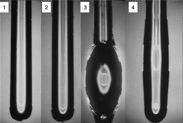 为解决这些缺点,一些提高涂层容量的研究方法相继报道。Hsieh等[21]将Nafion膜预涂在裸露的石英纤维基体上,然后再涂布ILs,所制Nafion膜支撑ILs SPME涂层成功应用于检测水中痕量多环芳烃。ILs和Nafion膜可用有机溶剂除去,每次分析后更新。实验对比了IL-SPME与Nafion-IL-SPME对同一样品溶液的萃取效率,结果显示后者的萃取量是前者的2~3倍。实验结果表明,Nafion膜的引入增加了纤维上ILs膜的厚度,提高了检测灵敏度,同时增强了涂层的稳定性。该涂层光学图像如图 1所示。Feng等[22]在不锈钢丝上电沉积一层咪唑聚合物膜,然后涂布ILs于聚合物膜面制备了聚咔唑-ILs涂层。该涂层与气相色谱-氢焰离子化检测器(GC-FID)联用成功应用于顶空固相微萃取(HS-SPME)分析芳香酯类化合物。该涂层寿命可达160次,能承受350℃高温。但上述以聚合物支撑膜的方法制备的ILs SPME涂层存在一个潜在缺点:支撑膜内的聚合物基体可能会和目标分析物产生相互作用,在萃取分析中形成一个复杂的吸附和脱附过程而降低萃取效率。