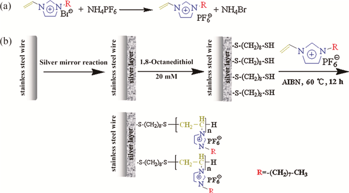2011年,Feng等[53]使不锈钢丝表面与ILs发生原位自由基聚合反应制备了一种PILs基SPME涂层。实验采用不锈钢丝为涂层支撑体,使其发生银镜反应涂上一层银,1, 8-辛二硫醇衍生使其带上活性巯基后,浸入离子液体[VOIm+PF6]、引发剂偶氮异丁腈(AIBN)混合溶液,热引发使其发生自由基聚合反应,得到原位聚合的poly (VOIm+PF6)涂层(如图 2所示)。实验以BTEXs及PAHs为模型分析物,考察了涂层的萃取效率。苯的线性范围0.2~1000 ng/mL,BTEXs线性范围0.1~1000 ng/mL。浸入式SPME分析酚类和PAHs模型分析物,同样取得较宽的线性范围。2012年,Feng等[54]又用相似的方法制备了芳香功能化poly (VOIm+NapSO3-)涂层。该涂层对一些PAHs校准范围0.02~200 μg/L,检测限0.005~0.01 μg/L。实验考察了涂层对几种邻苯二甲酸酯类增塑剂的适用性,检测限0.02~0.05 μg/L。2014年,Feng等[55]又采用相似的方法制备了不锈钢丝原位聚合MWCNTs掺杂PIL涂层。该涂层与GC联用,多重顶空微萃取分析了水果样品中的2-萘酚。结果表明,多重顶空SPME-GC具有高重复性(RSD为2.56%),对实际样品分析回收率为81.9%~110%。