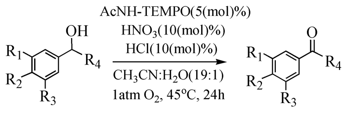 由于四甲基哌啶氮氧化物(TEMPO)具有捕获自由基、猝灭单线态氧和选择性氧化等功能,它与NaBr和NaClO一起组成的无金属氧化系统已经被证明对多糖体的伯醇羟基转化为羧基基团有较高的选择性[47]。近年来,此催化系统也被用于木质素的氧化反应中。Stahl等[48]对木质素模型化合物中的苄醇结构和脂肪醇结构的选择性氧化进行了研究,采用不同催化体系进行氧化反应,发现[TEMPO]+BF4-和无金属元素催化体系的TEMPO/HNO3/HCl对苄醇氧化有极高的选择性(反应式见图式10)。对于含苄醇的木质素模型化合物,使用无金属元素催化体系AcNH-TEMPO/HNO3/HCl都得到了高达82%~98%的收率。同时他们等还发现,反应的速率及产物收率随反应底物中芳环上甲氧基数目的增多而变大,这证明了甲氧基同芳环的共轭效应对此反应具有促进作用。需要特别指出的是,该催化体系对邻二醇结构也有选择性。邻二醇中的仲醇先于伯醇发生氧化,生成α-羟基酮结构,然后再进行部分氧化,生成邻二羰基化合物。对于对其他氧化催化剂有毒性的酚羟基结构,AcNH-TEMPO/HNO3/HCl体系也显示了较好的催化性能。对于真实的木质素,此体系也显示了较高的选择性。