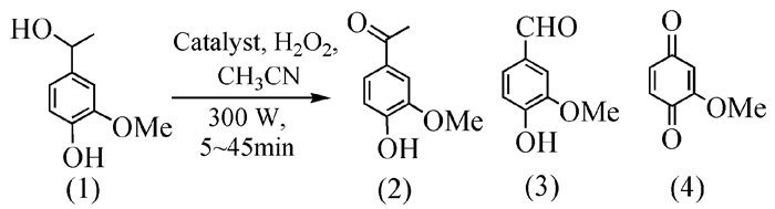 目前,国内外均有关于木质素及木质素模型化合物氧化降解方面的综述报道,但这些综述里有些只是侧重介绍了某单一种类催化剂(如仿酶催化剂[14, 60, 61])催化氧化降解木质素的方法,有些则是综述了木质素氧化降解得到某类物质如(酚类物质)的研究现状[62]。本文根据反应所用催化剂和进行反应所采用的辅助手段对木质素氧化降解进行了详细分类。目前,对木质素及木质素模型化合物氧化降解反应的研究具体分为:金属为催化中心的氧化降解、无金属催化氧化降解[46~49]、微波辅助氧化降解[35, 45, 50]、光催化氧化降解[51~56]和电化学氧化降解[57~59, 64]。按上述不同催化氧化降解方式从所用催化剂、反应条件、反应机理等几个方面对国内外学者的研究进展进行了综述。