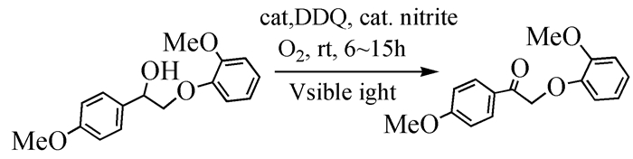 Katie等[53]发明了一种在可见光下使用催化量的二氯二氰基苯醌(DDQ)和亚硝酸钠或亚硝酸叔丁酯高效氧化苄醇和烯丙基醇(包括通过吸电子基团被钝化的)以及木质素模型化合物β-O-4的方法。这种方法甚至在微量的光照下都很有效。光对含有吸电子基团的苄醇的影响尤为显著。他们在光照和黑暗的条件下进行的一系列对比实验发现,所有进行反应的苄醇和烯丙基醇在光照条件下的反应转化率都明显高于黑暗条件下的转化率,反应时间可缩短。