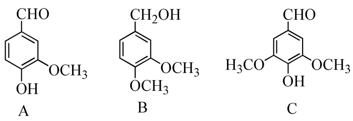 木质素是植物界中含量仅次于纤维素的天然高分子,与纤维素、半纤维素一起形成植物的主要结构[1]。木质素的部分化学结构示意图如图式1所示。木质素是自然界中唯一能提供可再生芳基化合物的非石油资源。它主要由碳、氢、氧三种元素组成,通常认为其是由苯丙烷结构单元通过碳-碳键和醚键连接而成的三维网状高分子物质,是复杂的芳香族聚合物[2],其中碳-碳键占1/4~1/3,醚键占2/3~3/4[3]。这两种键分子极性小、键能高难以反应,而且甲氧基含量高,羟基含量低,苯环上位阻大,所以木质素的活化改性成为现阶段研究重点。利用化学手段对木质素进行活化改性的方法主要有:催化裂化、酚化/酚解、还原、水解、羟甲基化、氧化、脱甲基化等。其中木质素氧化可以得到多官能团的单体,以制取一些醛和酸类精细化学品。例如,香草醛(图式2,A),已被广泛用于化妆香精,同时也是饮料和食品的增香剂;藜芦醇(图式2,B),具有强粘性,可抑制血小板聚集,减少心脏病的发生和控制其发展,同时可用于调节血液中胆固醇的含量,具有抗菌、抗癌、抗衰老作用;紫丁香醛(图式2,C),是淡黄色结晶体,广泛用于香料、农药化学和有机合成工业。此外氧化反应可以使空间网状结构的大分子在降解的同时,脱去起阻碍作用的酚羟基邻对位上的甲氧基。