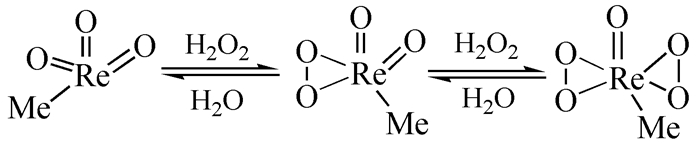 甲基三氧化铼(MTO)是含有Re (Ⅶ)的最简单的金属有机化合物,是一种高效选择性催化剂。它能有效地催化氧化酚型和非酚型木质素模型化合物的氧化降解(其反应主要是侧链氧化和芳香环卵裂反应),从而降低木质素分子量,提高其在溶剂中的溶解度,抑制木质素自由基的聚合程度。在H2O2的激发下MTO形成了过氧化铼中间体,包括一个单过氧化的[MeRe (O2) O2]和一个双-过氧化的[MeRe (O2)2O2] η2-铼复合物[4](图式3)。它们都具有良好的稳定性,正是由于这种中间体的形成才使得反应得以发生,并具有稳定性。