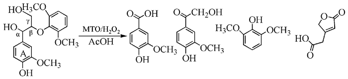 Crestini等[5, 6]报道了以MTO和MTOⅠ-Ⅳ为催化剂,在氧化剂H2O2的存在下,以乙酸为溶剂,室温下反应6h,能有效地选择性氧化工业木质素和木质素模型化合物。该课题组选取了一系列单聚和二聚木质素模型化合物进行反应,结果表明在以H2O2为氧化剂的固定均相催化系统中,MTO和MTOⅠ-Ⅳ能催化酚型、非酚型的单聚和二聚木质素模型化合物的氧化降解。实验过程中均发生了烷基侧链的裂解或同时进行的烷基侧链的氧化和芳香环卵裂反应,难以氧化的二苯基甲烷单元也能有效地被降解。不管是酚型模型化合物还是非酚型模型化合物,其氧化反应均发生在烷基侧链上。对于二聚木质素模型化合物,具体以典型的木质素β-O-4二聚体模型物愈创木基甘油-β-紫丁香基醚为例(图式4),在MTO的选择性催化作用下,H2O2首先进攻苯环上的C-H键,木质素丰富的β-O-4醚键可以氧化断裂98%,生成多种小分子酚类化合物。研究发现,MTO和MTOⅠ-Ⅳ在氧化二聚体模型物时,氧化反应均是以连接两苯环的C-C键断裂和苯环侧链上的氧化为主。