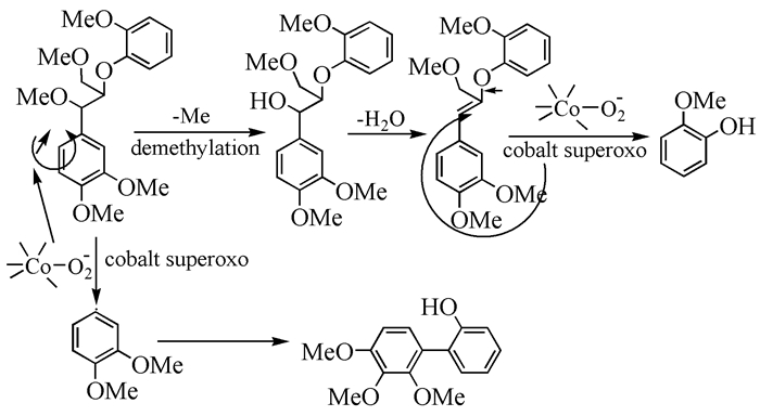 王蕊等[14]对金属配合物仿酶催化脱木质素的研究进行了总结,着重评价了卟啉类和非卟啉类金属配合物作为木质素氧化降解的仿酶催化剂的效果。金属卟啉配合物在相对温和的条件下具有较高的催化活性,但由于它的成本较高,给实际应用带来了一定的困难。由于金属酞菁、Cu2+/吡啶/过氧化氢组成的Gif仿酶体系、希夫碱等非卟啉金属配合物易于合成且具有较高的催化活性,已经引起了众多研究者的广泛关注。周学飞等[15~18]研究Co-salen仿酶催化氧化的反应机理表明,β-O-4型愈创木基木质素模型聚合物在Co-salen仿酶体系中主要发生β-O-4、Cα-Cβ连接的断裂,同时还发生醌型结构的产生和开环、脱甲基反应、酯化、α、β位氧化、Cβ-氨基化和缩合反应等;紫丁香基木质素模型物在Co-salen配合物仿酶催化反应体系中,发生β-O-4、侧链C-C、Cα-Ar断裂和苯环开环反应(见图式6)。这有利于木质素模型聚合物的碎片化,其在仿酶催化系统Co/O2超氧配合物的攻击下可形成苯醌类降解产物,然后进一步酯化、醚化,得到酯化、醚化降解物质,接下来这些降解物质进行酰胺化和氨基化,得到含氮类降解物质。在催化氧化过程中,木质素模型物的功能基发生了变化,进行了酚羟基与醛的缩合、酚羟基醚化和酯化、脱甲基、脱甲氧基等反应,同时还发生了苯环的缩合。